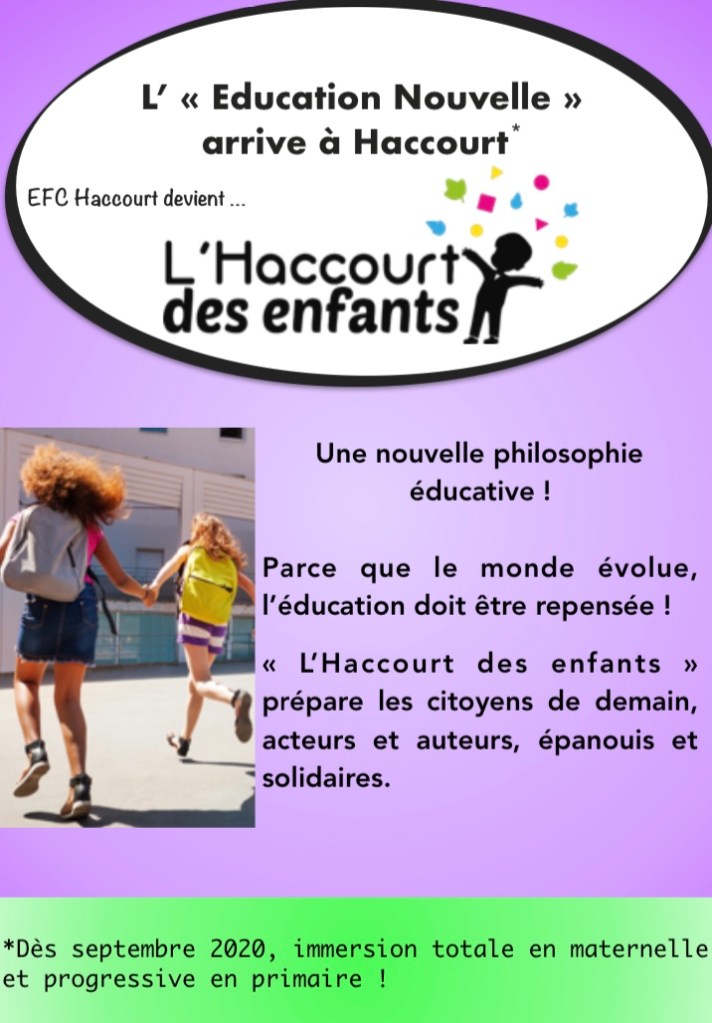 Rentrée 2020 l’école communale de Haccourt (publique, donc gratuite NDRL) débutera une grande transformation pédagogique. EFC Haccourt devient « L’Haccourt des enfants ». Les modifications s’effectueront dans un premier temps avec les enfants de maternelle ainsi que de 1ère et 2ème années pour progressivement évoluer en primaire par la suite.
