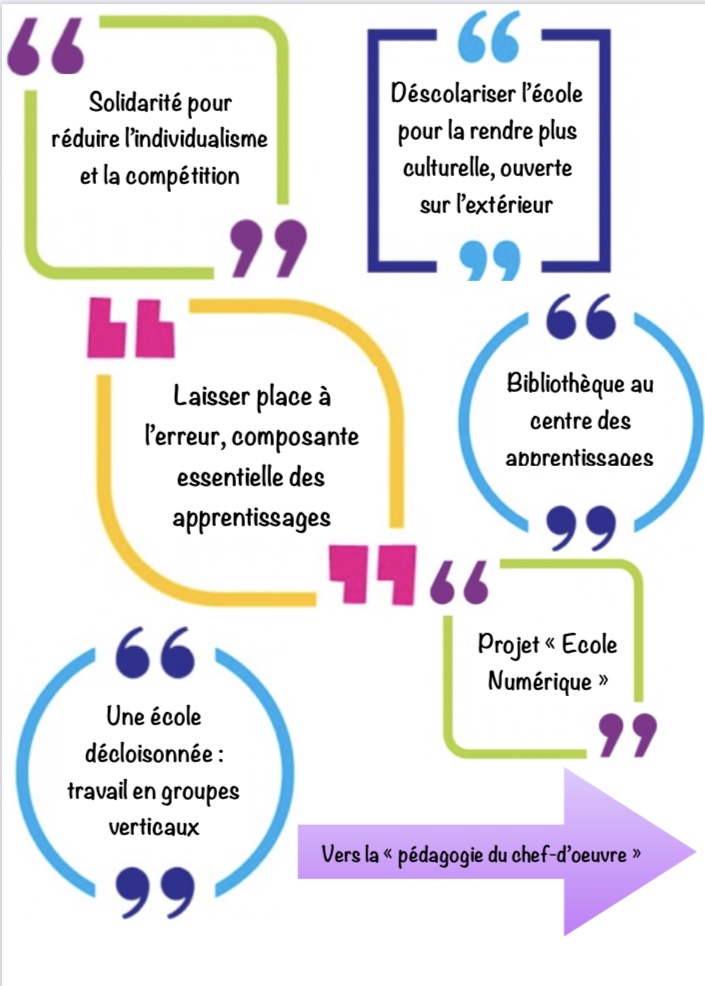 Un livre relatant lui-aussi les meilleures pratiques mais cette fois pour le primaire et le secondaire, est paru chez Chronique Sociale : « Du chef-d’oeuvre pédagogique à la pédagogie du chef-d’oeuvre ». J’ai participé à l’écriture de ce livre collectif en compagnie de Léonard Guillaume et Jean-François Manil entre autres. Cet ouvrage fait faire un grand pas en avant à l’Education nouvelle car il propose une alternative aux insupportables examens externes chiffrés qui guident tout l’enseignement vers les impasses habituelles : bachotage, compétition, rendement scolaire sans cesse mesuré, marginalisation de l’aspect culturel de la formation de base.
