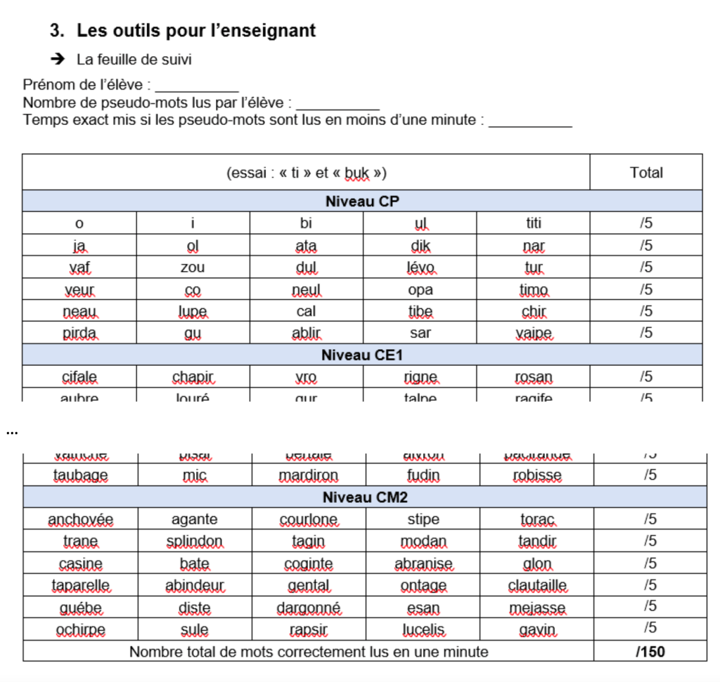 - Des listes de pseudo-mots sont adressées aux enseignant•e•s du CP au CM2 :