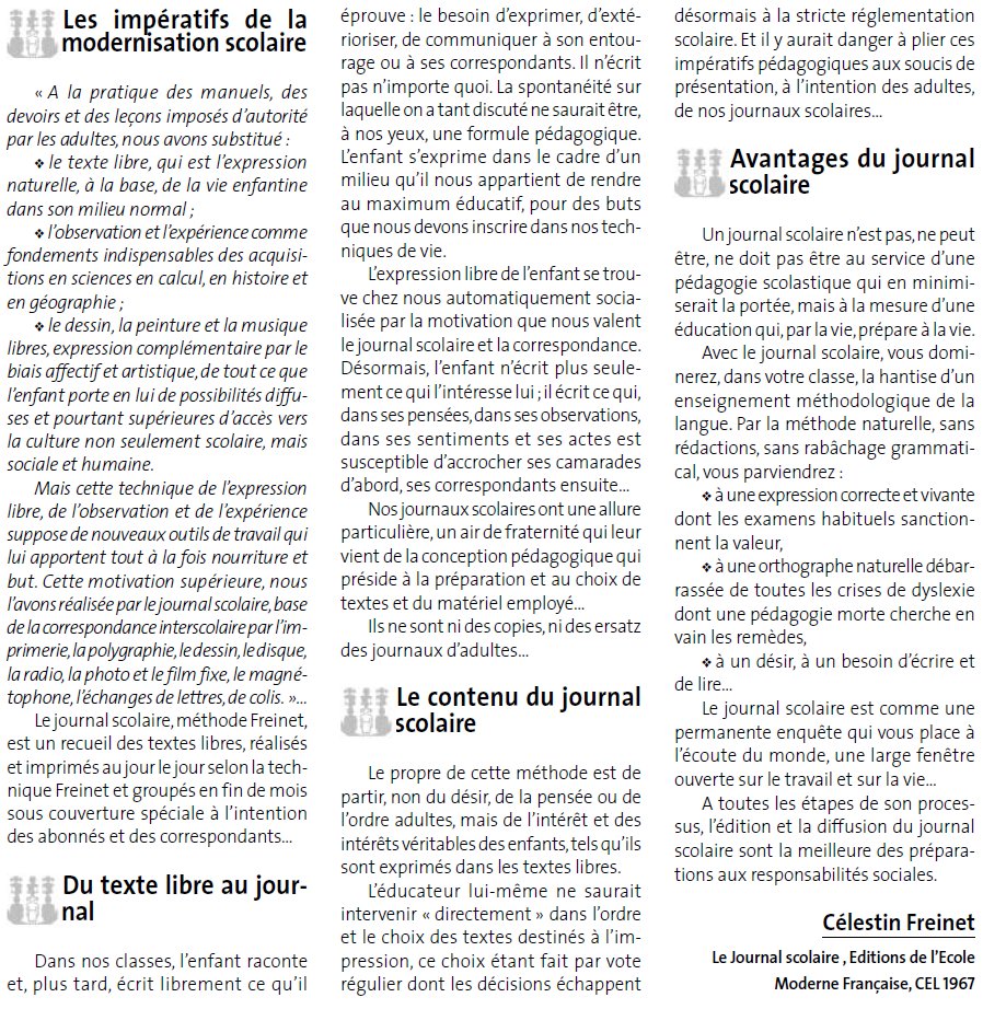 Voici des extraits de l’ouvrage de Célestin Freinet : « Le journal scolaire » paru dans le Nouvel Educateur de mars 2006. « Le journal scolaire, Editions de l’Ecole moderne Française », CEL 1967.