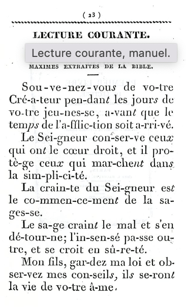 Le manuel de lecture courante ici est typique de l’enseignement tel que le voulait Guizot : à la moral et religieux pour empêcher le Clergé de s’introduire en masse dans l’Ecole. Et puis plus profondément, Guizot était d’obédience protestante.