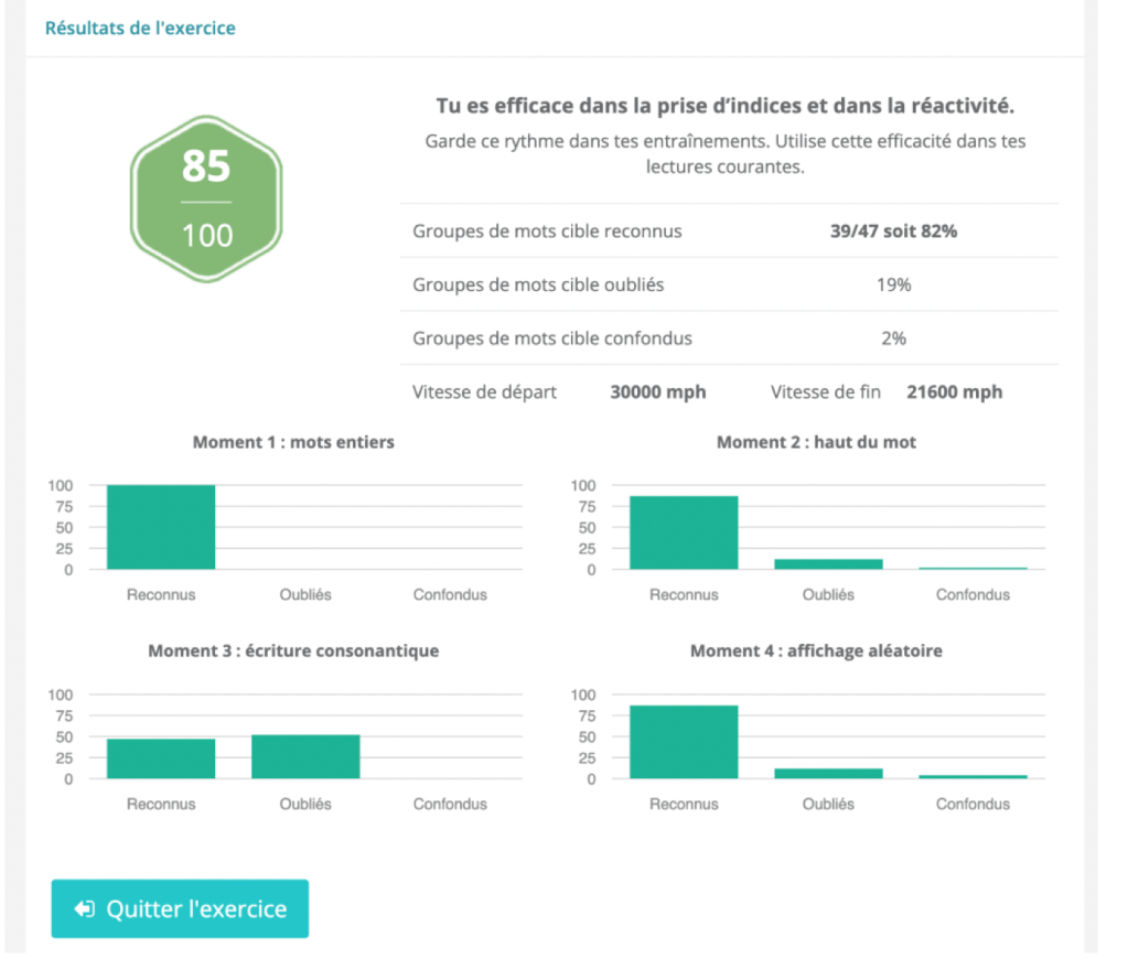 Il faut fixer le point noir au centre des mots ou groupes de mots. A la fin, le logiciel ne se contente pas d’afficher les résultats obtenus mais donne des précisions sur les réussites et les erreurs. Il permet ainsi à la personne qui s’entraîne de réfléchir à son action. C’est ce que l’on appelle la métacognition qui prend des formes diverses dans le logiciel pour responsabiliser celle ou celui qui s’entraîne, pour lui permettre de théoriser.