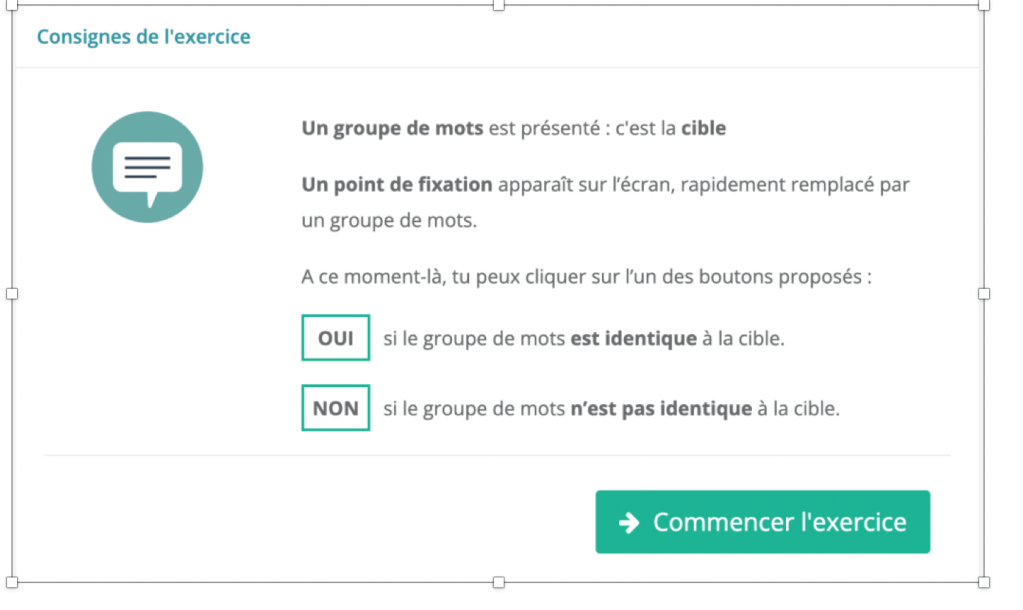 Descriptif : « L’exercice enchaîne 4 moments, constitués de 4 passages dont le déroulement est similaire : un groupe de mots cible est présenté au début, toujours en lettres entières. 15 groupes de mots lui succèdent, dans un temps très court, à partir d’un point de fixation qui matérialise l’endroit de la fixation de l’œil. Celui-ci est centré pour les 3 premiers moments, il se déplace sur la totalité de l’écran pour le moment 4. Les groupes de mots apparaissent en lettres entières au cours des moments 1 et 4. Dans le moment 2, ne s’affiche que le haut du mot et, dans le moment 3, que les consonnes