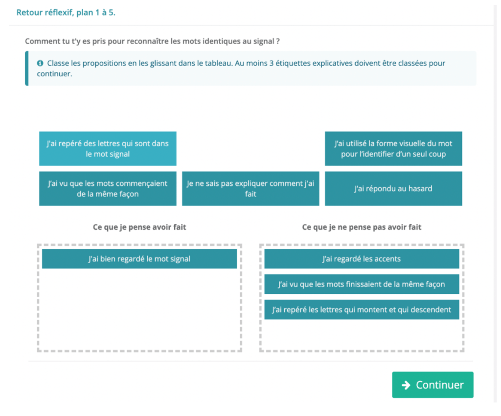« Après l’exercice est proposée une phase de retour réflexif, pour obliger le lecteur à réfléchir et prendre conscience de sa propre démarche, afin de l’améliorer.