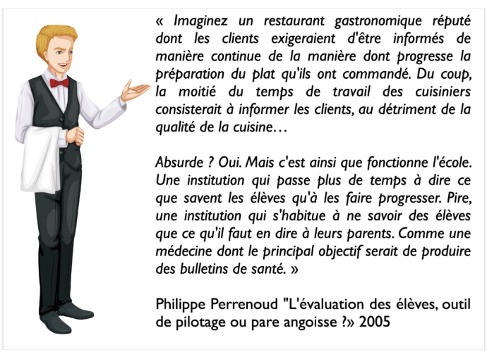 « [Les auteurs] s’inquiètent du fonctionnement de l’Ecole à la française qui « est censée instruire par mémorisation sans agir, sans échanger, sans donner, sans partager et sans faire